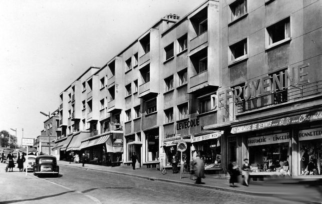 paliers que soulignent les ruptures marquées des larges baies des vitrines et de la succession des auvents qui les protègent. Lurçat donne au bâtiment une façade