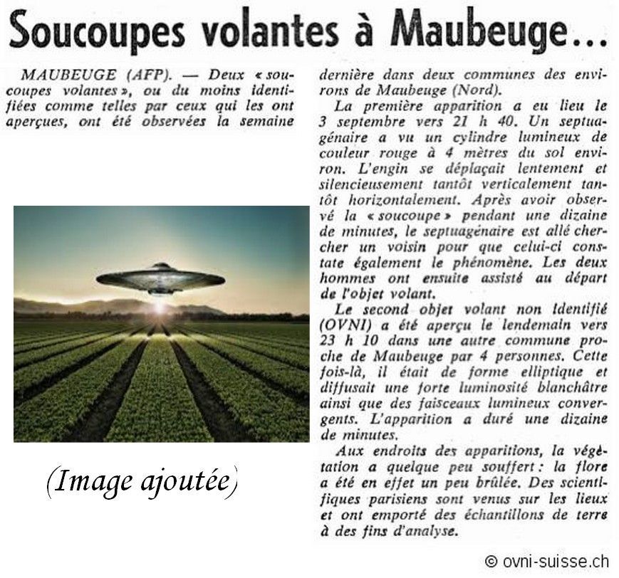 M. et Mme Mozin voyageaient vers Maubeuge en voiture quand ils ont vu une lumière sur la route devant eux. Pendant qu'ils s'approchaient, ils ont vu qu'elle provenait de l'intérieur d'un objet en forme d'obus épais. Cet objet avait environ 6 pieds de diamètre et de 7,5 pieds de haut, et reposait sur 3 jambes de 1 pied. Cela avait une couleur métallique blanchâtre. Une ouverture large baillait sur lui sur le côté faisant face à la route; dans laquelle ont pu être vus des câbles épais et un être d'environ 4 pieds de haut avec une tenue boudinée, qui semblait se préparer à fair un pas dehors. Il a été emballé dans des "boudins" comme "l'homme des pneu Michelin" et portait des bottes et un casque très large. Son visage n'a pas été vu. Les Mozin sont passés à moins de 15 pieds de l'objet. Les phares de la voiture se sont éteints quand ils sont arrivés à 300 pieds de l'objet, et se sont rallumés de nouveau 300 pieds après lui. Le jour suivant, M. Mozin a trouvé une zone carbonisée de huit pouces "dégageant une odeur rappelant le benzène"; entouré par 3 profondes impressions de quatre pouces, sur un cercle d'un diamètre d'environ 4,5 pieds.