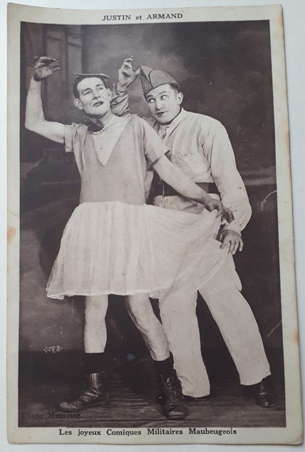 Armand Souvenbrie, mon grand-père, à droite, une photo carte postale retrouvée dans un album de mes parents, il est né en 1900 et devait avoir 22 à 25 ans. A longtemps vécu à sous le bois et travaillé au tilleul. Je sais maintenant d'où me viens le goût de la scène ! Je ne sais pas qui est Justin, si certains de ses descendants sont ici ..