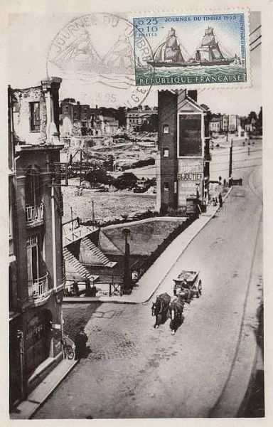 Après la terrible destruction du Pont du Moulin par les Allemands , cette carte postale montre que les bâtiments de la « Société Générale » à droite et celui du magasin de fournitures « Dépret » sur la gauche sont complètement détruits