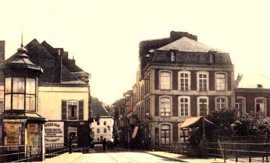 Cette photo sur laquelle on voit le magasin de réparation "phonos Pathé " date de la passerelle provisoire en attente de la reconstruction du pont du Moulin détruit lors de la fin de la première guerre mondiale en 1918.Mais où l’on peut y voir également la boulangerie Lecluyse reconstruite, après son incendie, par la famille Lecluyse.