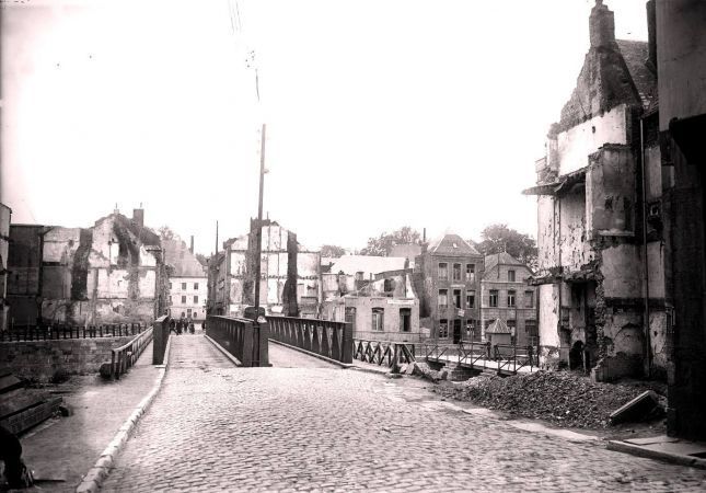 On peut constater que le pont a été entièrement détruit ainsi que son environnement immédiat dont la boulangerie Lecluyse au fond à gauche.
