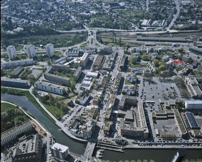 Jusqu’aux destructions de mai 1940, le centre-ville se présentait comme une ville de type hennuyer : toits pentus, fenêtres étroites, rues de faible largeur pavées, immeubles serrés et enchevêtrés formant des îlots et places à la géométrie quelconque. Quelques îlots furent épargnés ou reconstruits sur leur propre base, pour s’associer et s’intégrer dans le plan rationnel de la ville reconstruite établi par André Lurçat. Les morceaux de ville ancienne s’implantent en plus grande densité sur la rive gauche de la Sambre :