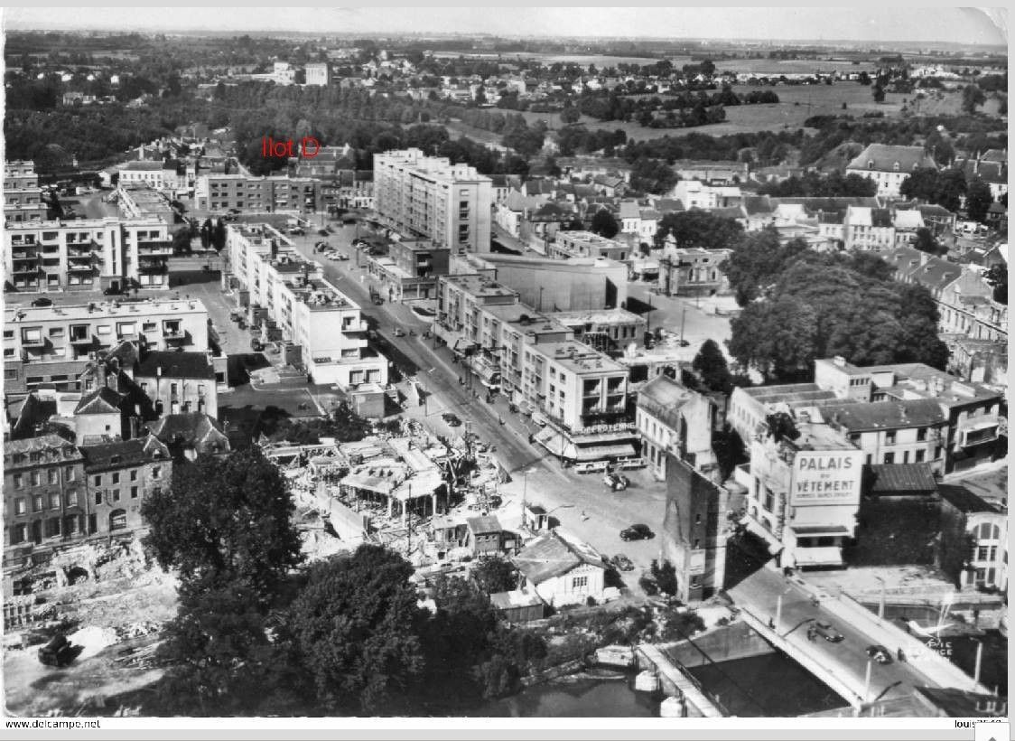Histoire : L'îlot P a été construit dans une zone qui n'était pas construite au moment de la destruction de la ville en mai 1940. Les différents immeubles à logements et une maison ont été construits entre 1947 et 1956 par André Lurçat, architecte-urbaniste en charge de la reconstruction de la ville et des architectes régionaux et locaux associés. Les blocs 1 et 2, également appelés Gounod et César Franck, faisant partie des ISAI (immeubles sans affectation immédiate), sont situés sur le côté droit de le rue des Arts Ces immeubles ont été construits par les architectes Maurice Gouvernet, André Lurçat et Henri Lafitte ou Marcel Mélon entre 1947 et 1949. Les sources sont contradictoires : les travaux historiques mentionnent l'architecte Henri Lafitte et les archives Lurçat citent Marcel Mélon. Le bloc 3, composé des immeubles Bizet et Lalo, situé sur la Place des Arts, a été réalisés entre 1949 et 1951 par les architectes Maurice Gouvernet et Jean Badovici. Le bloc 4, situé avenue de Verdun, est la maison du notaire Levecq, actuellement transformée en centre de paiement de la sécurité sociale. Cette maison a été construite entre 1949 et 1951 par l'architecte Armand Lemay, architecte lillois, qui a fait plusieurs projets de reconstruction de maisons individuelles sur les communes d'Aulnoye-Aymeries, Bachant et Pont-sur-Sambre. Le bloc 5 abrite la Caisse d'Epargne, ssituée entre l'avenue de Verdun et la rue B. Delessert. L'architecte Jean Badovici l'a construit entre 1949 et 1951. Le bloc 7 est constitué de cinq immeubles disposés en alignement, entre l'avenue de France et la rue Guénin et a été construit entre 1954 et 1956 par l'architecte Panos Djélépy.